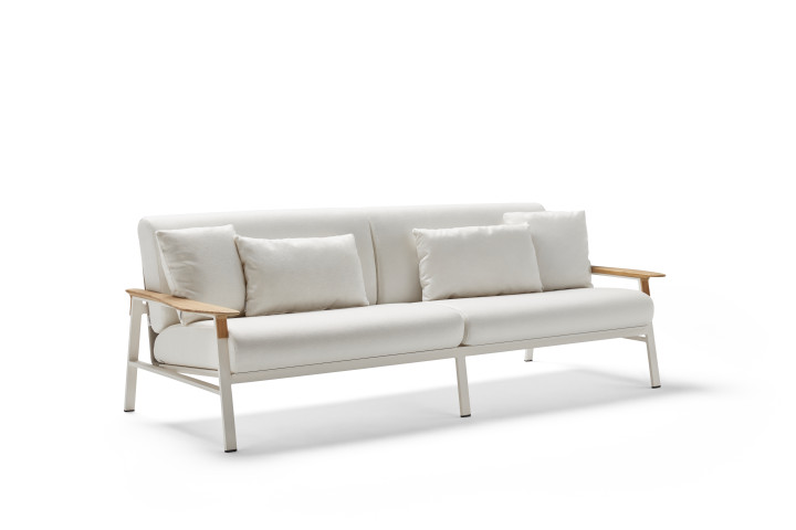 Esta colección trata de describir, de manera contemporánea, un arte de vivir mediterráneo, que no tiene que ver con el tiempo. Es un universo donde el sol y la tierra se unen. Su principal característica una estructura de aluminio pintado en polvo, con brazos en madera de teca y unos confortables y mullidos cojines. Este conjunto crea una composición de gran comodidad y armonía. Las tres piezas de la colección -un sillón, un sofá doble y uno triple, destilan clasicismo y elegancia y sus cojines pueden ser personalizados tanto en estampados como en colores. La colección se complementa con cuatro mesas: dos mesas de centro y dos mesas de esquina.